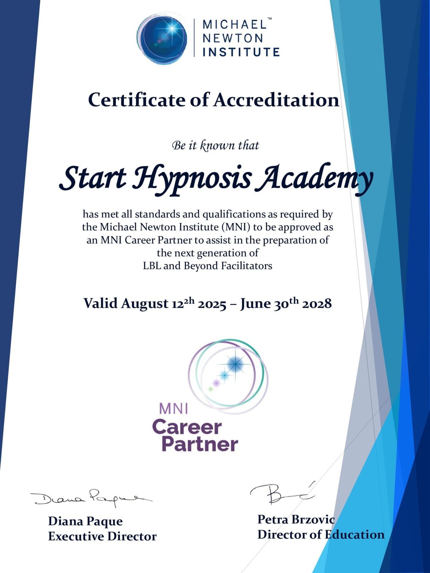 Start Hypnosis Academy is proud to announce that we have been officially certified by the Michael Newton Institute as a Career Partner.
